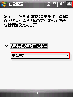 A-2. 勾選自動配置,選擇電信業者為"中華電信",按螢幕右上角的[Ok]或[確定]